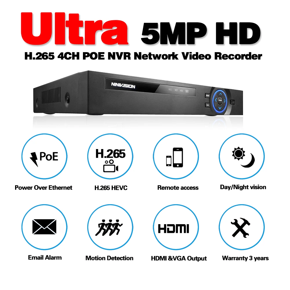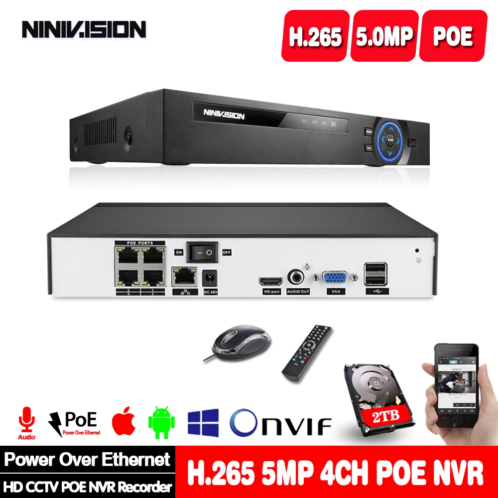 NINIVISION H.265 48V POE NVR 4CH 5MP Audio Surveillance Security IP Camera CCTV System ONVIF P2P Ne